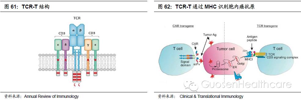 TCR-T在可以识别胞内蛋白,潜在靶点数量更多。TCR-T是将识别特异癌症关联抗原(Tumor associated antigen,TAA)的T细胞受体(T cell receptor,TCR)表达在T细胞表面,从而实现“精准治疗”的另一种T细胞免疫治疗方法。与CAR-T技术只能识别胞外或膜上抗体(潜在靶标占比30%)比较,TCR可以识别经由主要组织相容性复合物(Major histocompatibility complex,MHC)提呈出来的胞内抗原。所以可用于识别的受体种类更丰富(潜在靶点占比70%)。