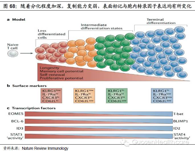 分化早期T细胞增殖能力强、体内持续时间长。T细胞分化是由TSCM( stem cell memory )、TCM(central memory )、TEM(effector memory ) 到最后TE (effector T cells) 一步一步分化而来。越早期的T细胞增殖能力越强,越后期的杀伤能力越强。如果需要持续的细胞增殖,需要有足够多的早期细胞被转基因。