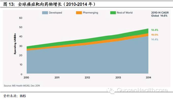 全球癌症医药市场规模达到千亿美元。根据IMS的数据,2014年全球癌症医药市场达到1000亿美元。2010年时还仅为750亿美元,增速高于整体医药市场增速。并且2010-2014年靶向药增速达到14.6%,在2014年已经占比高达50%。在美国人均负担癌症药物达到了约100美元。