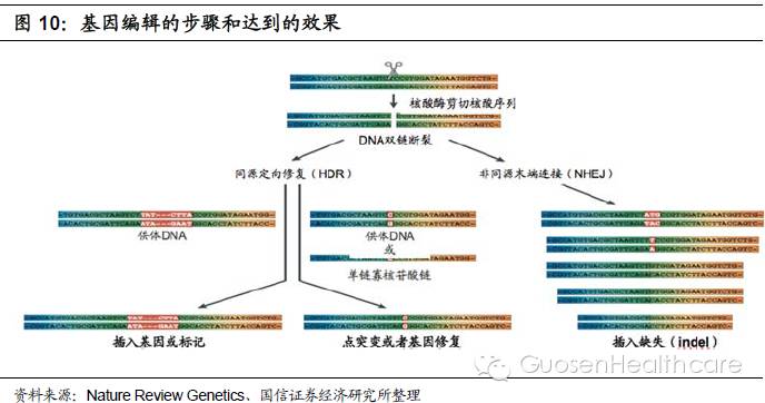 需要注意的是,剪切完之后的修复过程与剪切大致是相对独立的。有两种修复方式,第一种是同源定向修复(Homology directed repair,HDR),在提供模板的情况下,可以插入、删除或者点突变目标DNA位点;第二种是非同源末端连接(Non-homologous end-joining,NHEJ),不需要模板即可能插入、突变、删除不确定的序列。
