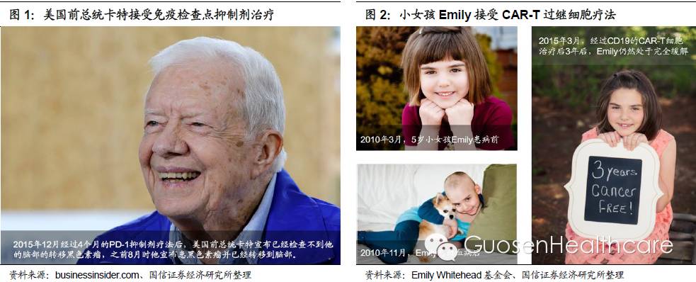 癌症免疫疗法在部分癌症中取得优异疗效。癌症免疫疗法是继手术切除、放疗、化疗、癌症相关抗原靶向疗法、癌症特异性激酶抑制剂等传统方式之后出现的对抗癌症的新的思路,并且在部分癌症中取得了非常良好的效果。美国前总统卡特在2015年12月宣布他经过4个月的PD-1免疫检查点抑制剂治疗后,脑部转移的黑色素瘤已经完全消失;五岁小女孩Emily在Carl June团队的抗CD19的CAR-T免疫细胞治疗后至今仍然处于完全缓解状态。这是第一个采用CAR-T疗法达到治愈的儿童患者。