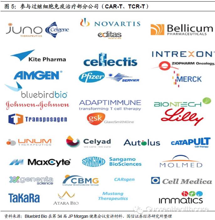 第一、癌症过继免疫细胞治疗在海外蔚然成风。癌症免疫疗法是癌症治疗领域突破性进展,其中的过继细胞疗法通过补充外源性免疫细胞在血液瘤中取得了良好的疗效。2014年相关海外标杆企业迅速上市,大型药企或直接参与或与技术初创企业合作纷纷涉足,标的十分丰富。当前主要有诺华、Juno和Kite三家一线标的;Adaptimmune、Intrexon、Bluebird、Cellectis、Nantkwest等数家二线标的;Sorrento、Bellicum、西比曼生物科技等三线标的。