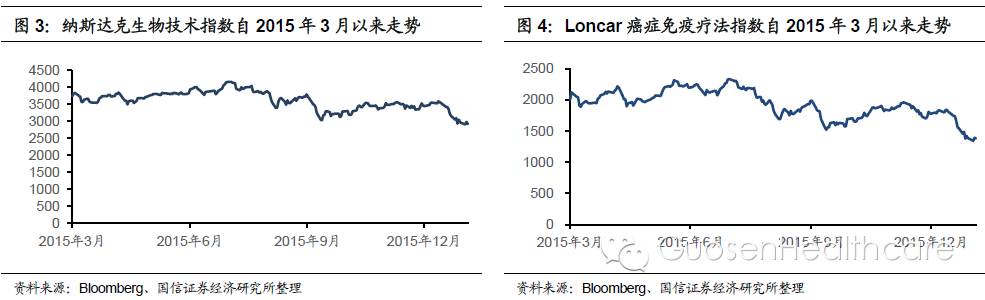 癌症免疫疗法获得资本市场重视,近半年来股价有所回撤。众多国际大型药企均通过合作或自身研发进入癌症免疫疗法领域。在2015年五月更有小型公司Loncar投资公司开创了癌症免疫疗法指数,并于10月设立了ETF(代码:CNCR,当前市值1500万美元),跟踪癌症免疫疗法相关标的走势。近半年来,由于对于美国药物价格管控的争议、免疫疗法的在实体瘤中的有效性疑虑、部分公司技术可能被后来者超越、免疫疗法出现部分副作用等原因,癌症免疫疗法指数跟随纳斯达克生物技术指数出现了下跌。