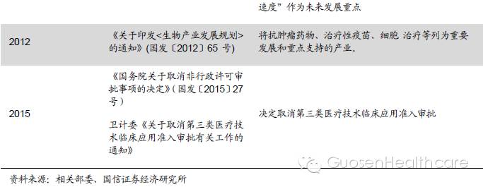 国内政策鼓励发展免疫细胞治疗技术,但是临床审批具体政策欠缺。我国总体政策上对免疫细胞为代表的前沿治疗技术是持支持态度的,先后于2011年、2012年均出台了对生物技术的支持性文件。,并规定实行第三方审核制度,同时出台了《自体免疫细胞(T细胞、NK细胞)治疗技术管理规范(征求意见稿)》,但是此后该技术管理规范的正式稿迟迟未出台,因此卫计委实际并未组织开展自体免疫细胞治疗技术相关的临床试验,卫计委委托的技术审核机构也未组织对医疗机构的评比。
