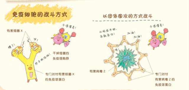 比如,讲到过敏发生的原因时,免疫细胞们变成了阻拦外来物入侵的士兵,面包变成了皱着眉头祈求通过的“面包人”。