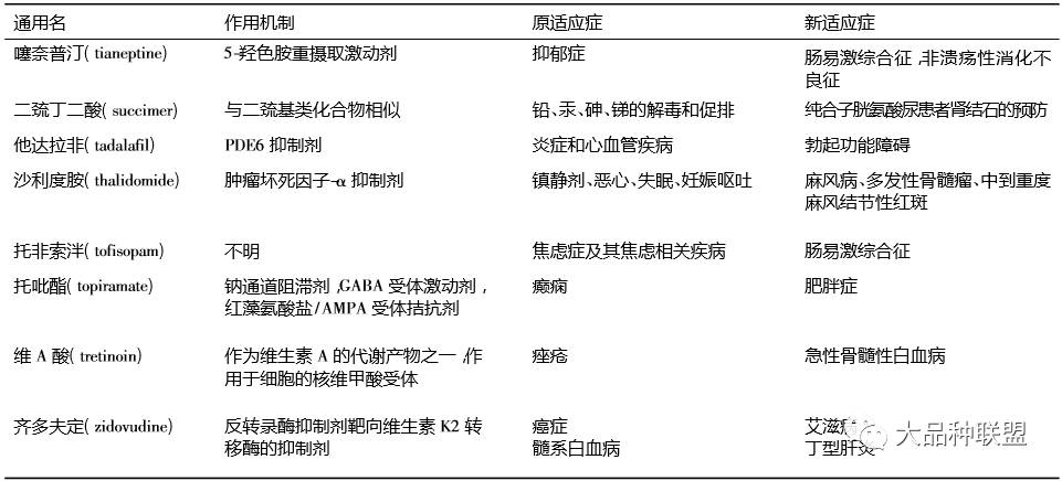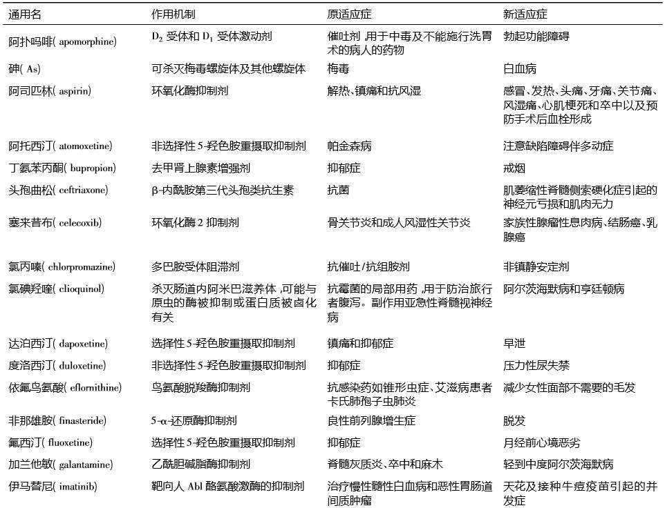 从已知药物中发现新适应症,成功重定位的药物已有100多种,表1所列为其中具有代表性的40余种,这些药物有的是在临床用药或实验研究时偶然发现、并经进一步研究确定的;有些则是基于新思路研究或通过其它途径发现的。目前则多从专门为研发药物重定位所建立的技术平台筛选和基于计算机的方法所发现,即理性发现,这将大大提高发现效率。
