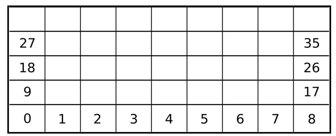 比如在上面这个图中,很明显要获任意一个网格单元的编号非常容易。例如如果获得某网格单元右边毗连的网格单元编号,只需要在网格单元编号上加1即可。如果获得某网格单元上边毗连的网格单元编号,只需要在网格单元编号上加9即可。