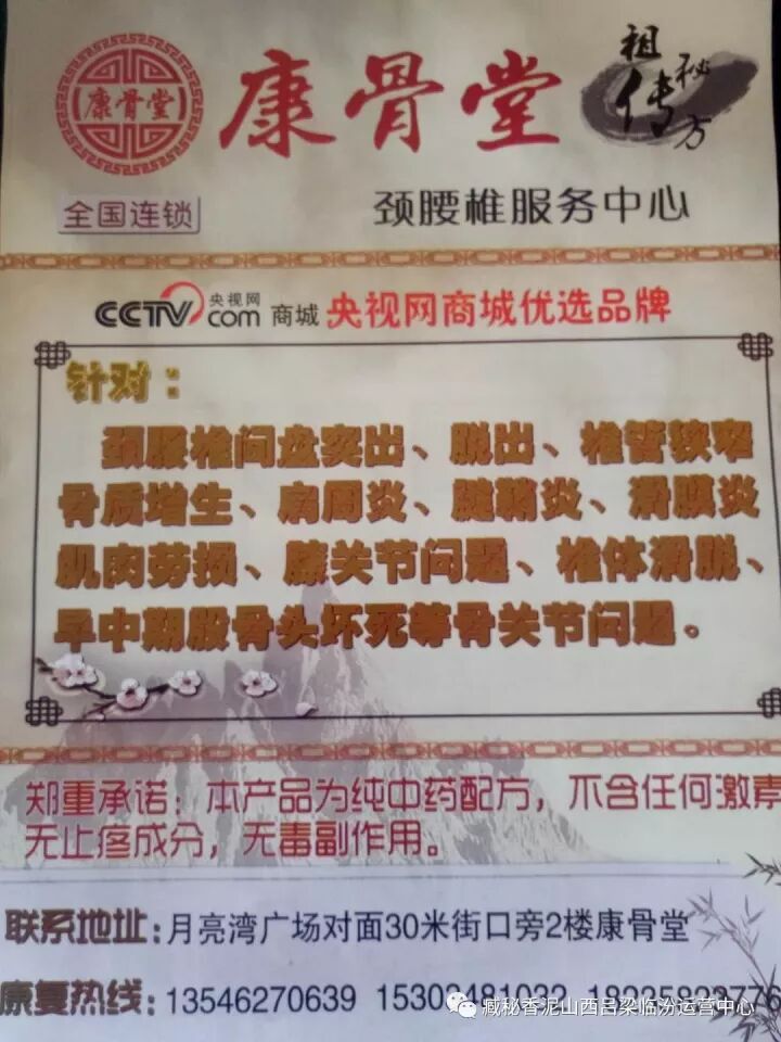 康骨堂(CCTV.COM央视网优选品牌、中国好物产、cctv《赢在品牌》栏目组合作伙伴、NBA常规赛事展示企业)采用祖传三代秘方产品,外加特制外用热敷中草药的绿色康复产品,历经100余年临床发现,对腰间盘突出、膨出症、颈肩综合症、胸椎病、肩周炎、关节炎、各类骨质增生、早中期股骨头坏死等骨病问题,有良好的康复效果。让广大顾客朋友不走弯路,无痛苦,安全又经济。多年来,本康复方法为众多顾客祛除病痛折磨,恢复健康生活。