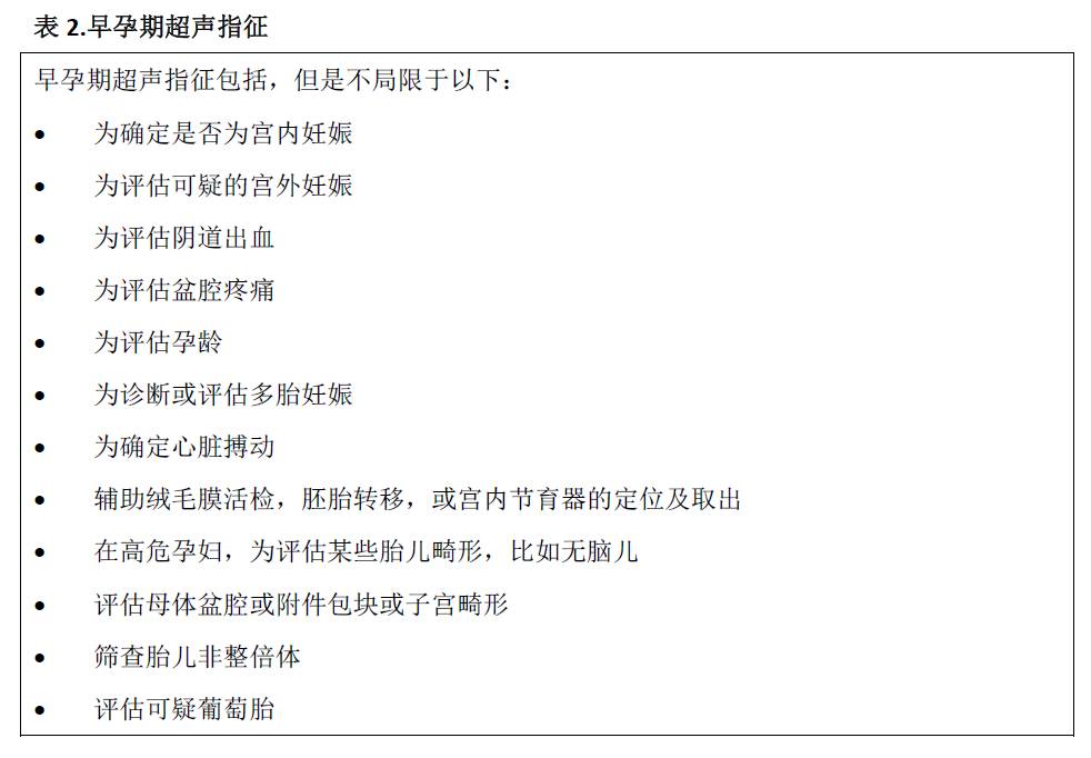 指征:早孕期的超声检查应该在14 0/7周之前进行,表2中是早孕期超声检查的部分指征。