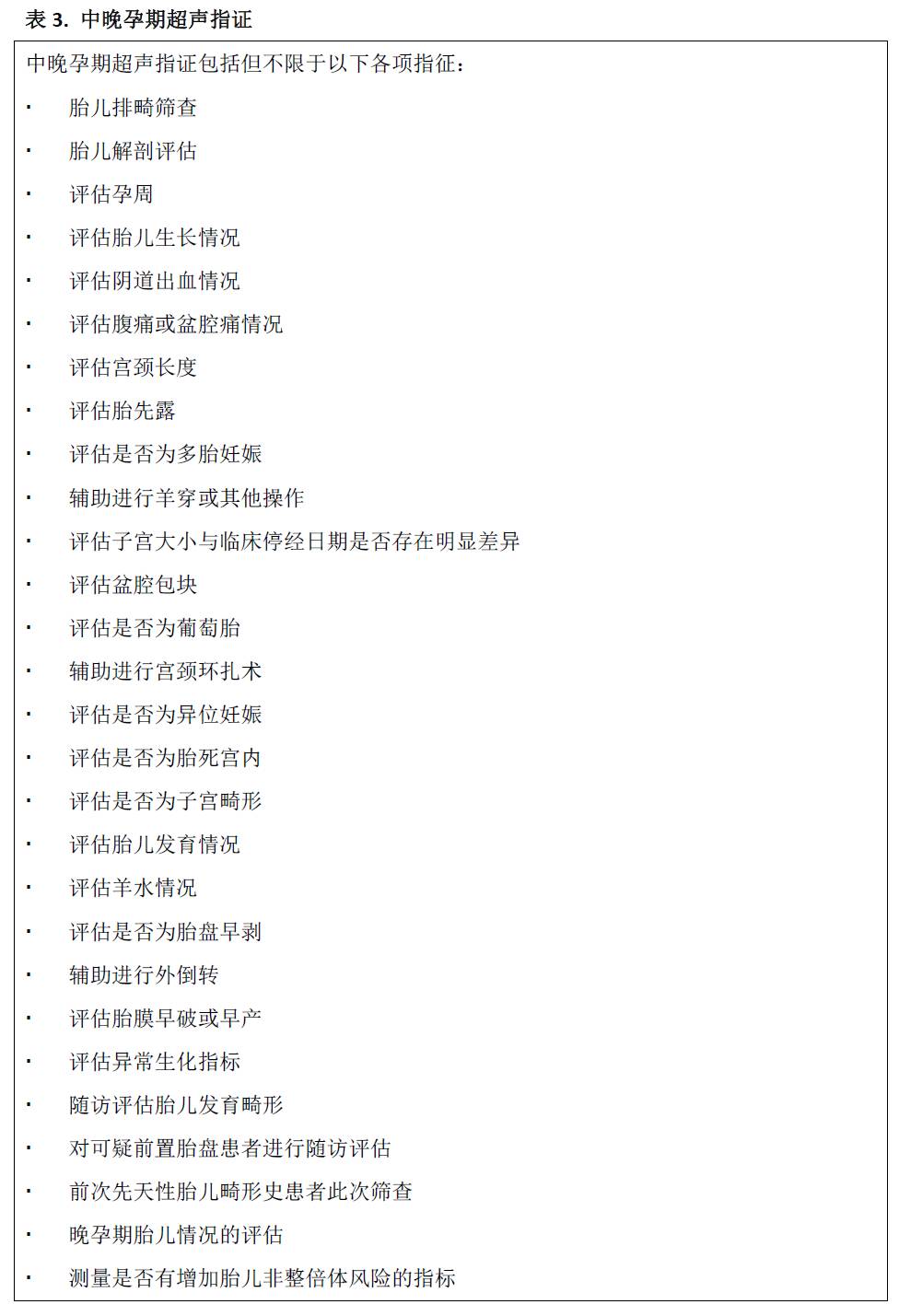 指征:中晚孕期,超声检查在很多情况下都是有益的。中晚孕期超声检查指征详见表3。