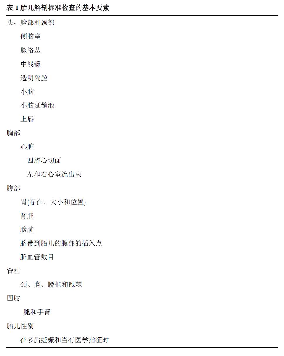 在标准检查中,胎儿解剖的必须内容列在表1中,通常可以在孕18周后可以看到,但也可能此前看到。有时由于胎儿大小、位置和活动;母体腹部瘢痕;母亲腹壁过厚;羊水过少,胎儿的某些结构难以看清。当技术限制导致图像不理想时,应该在报告中记录局限性,并考虑随诊。
