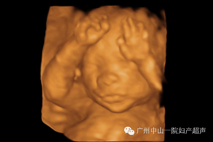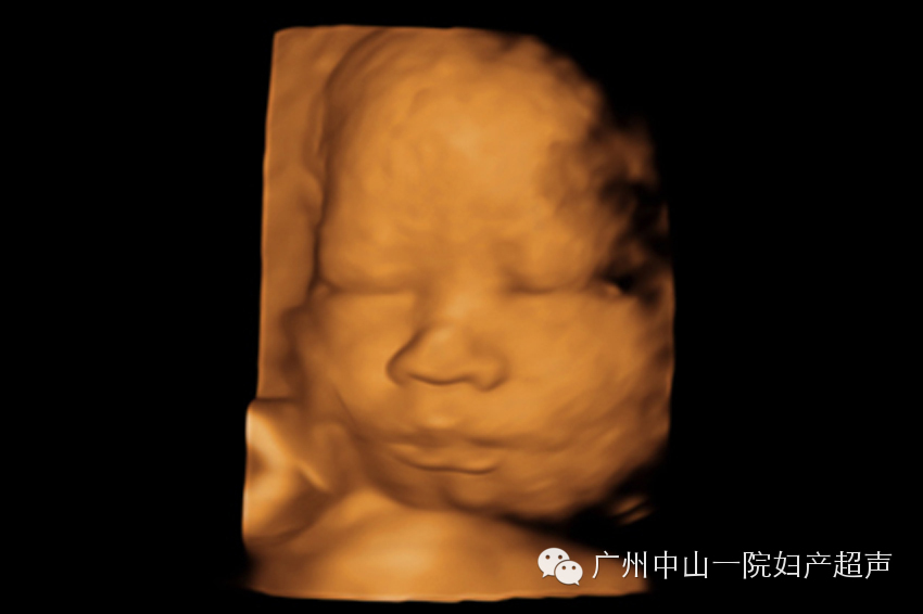 此次检查最重要目的是观察胎儿全身各系统结构是否存在畸形。这个时候,胎儿已经比较大了,三维超声无法获取胎儿的全身照,道理就如同相机无法近距离拍摄大物体的全貌一样。我们通常只建立宝宝的面部三维图像,满足准妈妈们求貌若渴的心情。如果条件良好,宝宝的五官可以清晰的呈现出来,嘴唇、鼻子、眼睛(通常是闭着的)甚至人中都可以一一分辨。对于我来说,工作中最开心的部分就是看着准妈妈们对着宝宝的照片评头论足,感受超声技术的神奇和母子之间的情感交融。