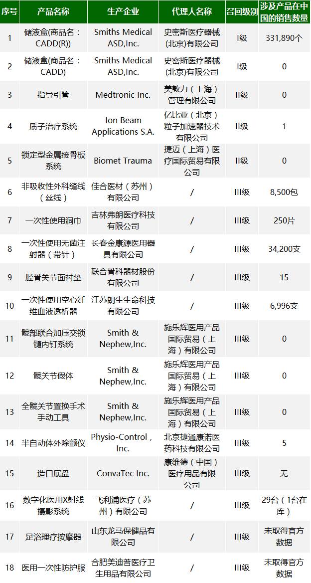 近期,,共涉及18个产品。其中包括2项I级召回,3项II级召回,13项III级召回。详情如下: