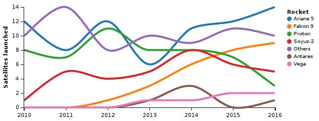 各商业火箭卫星发射数量,阿丽亚娜-5火箭由于频繁一箭双星因此数量最多,小型立方星不纳入数量统计