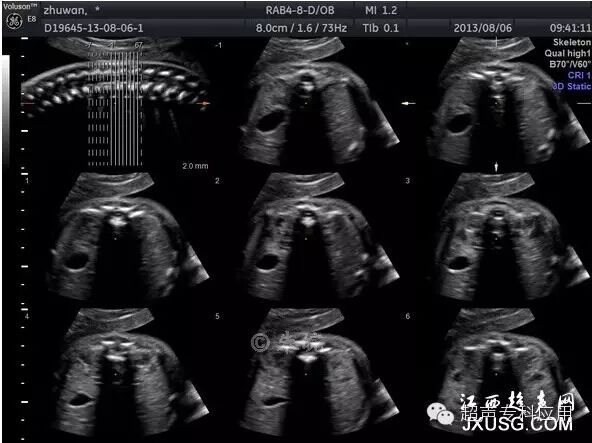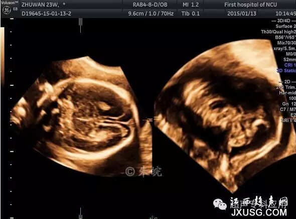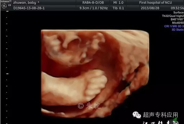 1.6 胎儿上腭的三维超声成像 对于唇裂胎儿,产前往往需要评估上腭的情况,以咨询双亲。有文献报道了利用三维重建面部反观冠状平面检查胎儿上腭,发现诊断唇裂的敏感性为95%,假阳性率7.7%;上牙槽裂的敏感性为84.5%,假阳性率7.2%;硬腭裂的敏感性89.7%,假阳性率15.6%。