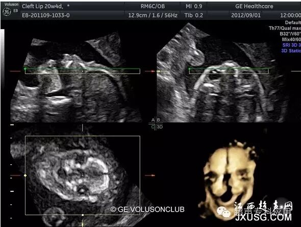 胎儿唇腭裂三维成像-右下角三维冠状面显示腭裂