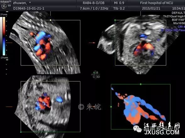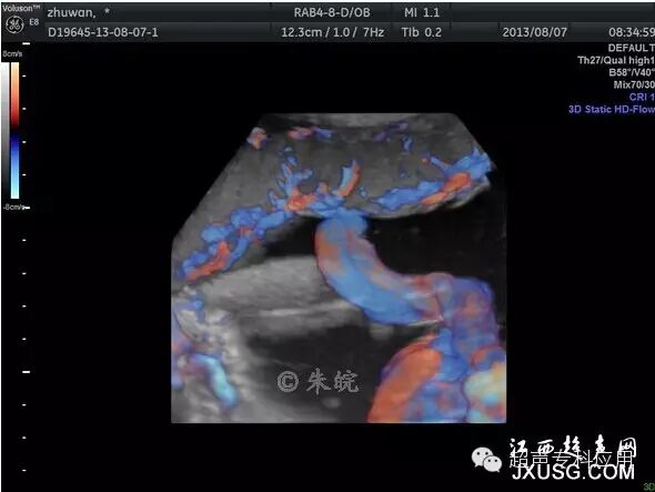 胎盘脐带插入口能量三维成像,显示胎盘血流分布状况![]()