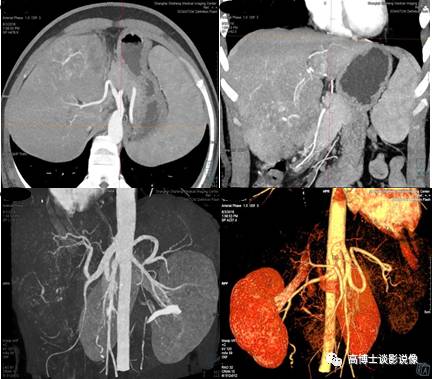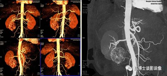 MIP重建显示肾脏肿瘤的供血类型、供血动脉、肿瘤血管团及有无动静脉瘘形成,显示动脉血管有无侵犯,显示肾静脉、下腔静脉内有无癌栓形成。去骨VR整体、直观显示双肾动脉整体解剖和变异血管起源、数目、走行等,判断其变异类型,显示有无异常血管团及狭窄、中断。为外科手术方案的制订、预防术中并发症及预测肿瘤的可切除率方面提供依据。