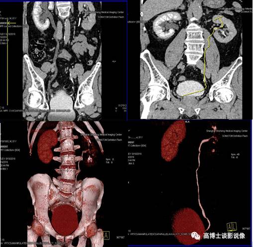 CPR重建整体、全程显示输尿管结石及梗阻情况。去骨或非去骨VR重建,整体、直观显示整个泌尿系的轮廓、大体形态及梗阻情况,初步判断肾脏功能情况,同时整体显示全腹部动脉的走行、形态及有无异常。此例显示:右输尿管末端膀胱入口处结石伴右肾盂、右输尿管全程积水扩张,右肾显影功能延迟。