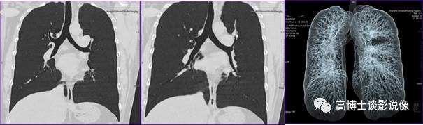 双侧斜冠状位MinP(最小密度投影)显示气道情况。使用VRT虚拟成像整体显示气道情况(密实或透明化)。了解气道有无狭窄以及狭窄的位置、程度、范围、原因等,能无创性评价气道的狭窄,尤其适用于支气管纤维镜不能通过者;了解气道的顺应性等功能情况及气道狭窄周围肺组织的情况;气道狭窄支架置入术后,了解支架的通畅情况。