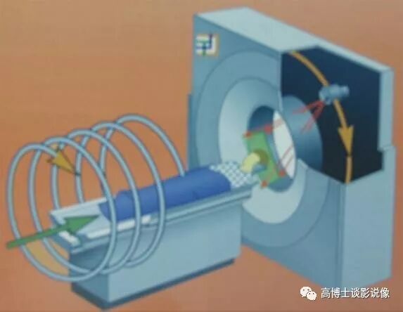 螺旋CT扫描数据采集示意图:病人在检查床上匀速进入CT机架,扫描采集数据分布在一个连续的螺旋形空间内,得到的数据是三维的,通过计算机处理可以任意方向或者平面进行重建。