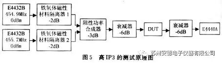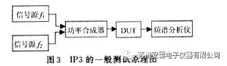 ②在其他条件不变的情况下,比较加上DUT和不加DUT测得的互调分量电平值。如果后者的电平值比前者的小得多则说明所测结果是DUT产生的互调分量;否则,测试结果无效。