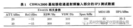 根据该测试方法,对CDMA2000基站接收通道射频输入部分(从低噪声放大器输出端到第一混频器输出端)的IP3进行了测试。其测试原理图如图5所示。其中,E4432B和E4440A均为Agilent公司的测试仪器。信号源输出的单音信号频率是根据3GPP2协议要求来确定的:分别偏离中心频率(454 MHz)+900 kHz和+1700 kHz。
