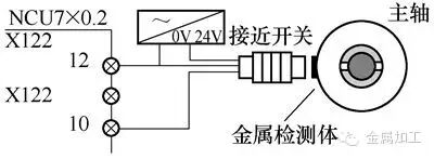 ( 2 ) 与西门子840D sl 数控系统连接。将接近开关输出接到NCU7×0.2的X122的12脚,并保持接近开关的地与X122的9脚共地(见图2)。