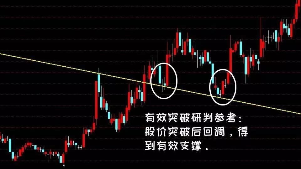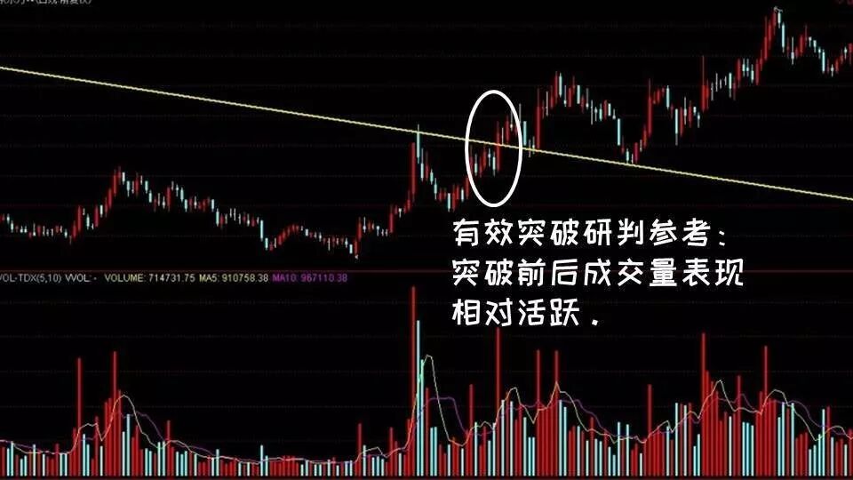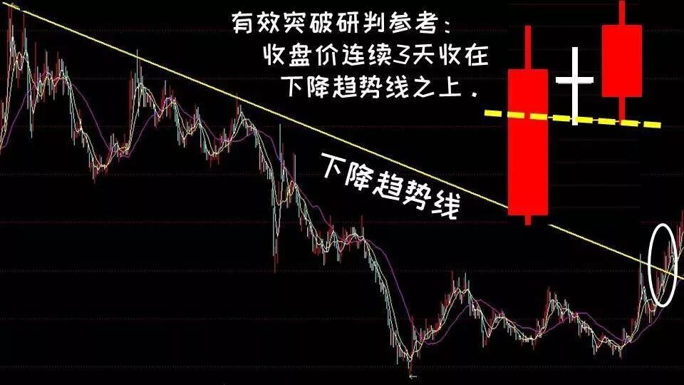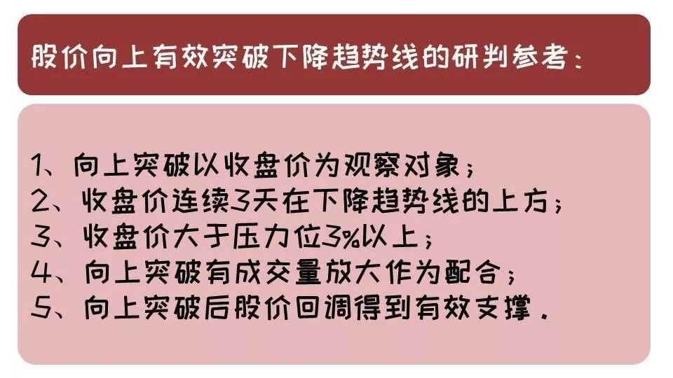 在实际看盘过程中,研判股价对下降趋势线的向上突破是否有效,这几条研判参考未必需要全部具备,当然满足的条件越多,有效性就越强。