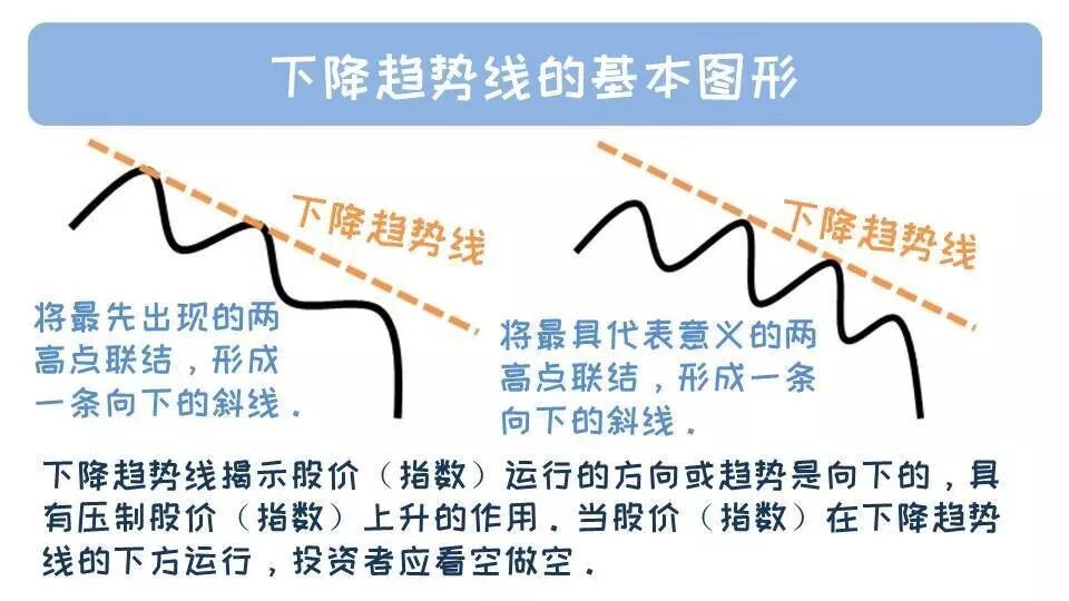 我们可以使用看盘软件中的画线工具来绘制下降趋势线,具体的绘制方法有两种,一种是将一段K线行情中最先出现的两个股价高点联结起来,我们会发现股价每次反弹的高点一次比一次低,所以会形成一条向下倾斜的斜线。另一种画法是将一段K线行情中最具有代表意义的两个高点联结起来,同样形成一条向下倾斜的斜线。