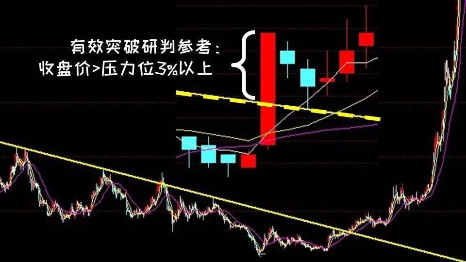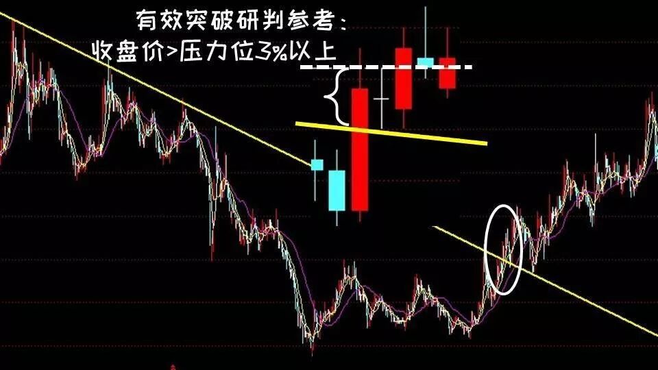 如果股价突破下降趋势线当天,突破幅度没有达到压力位之上3%的涨幅,而随后几天内收盘价持续上涨,超越压力位之上3%的涨幅,我们也能将其看成是有效突破的研判参考之一。