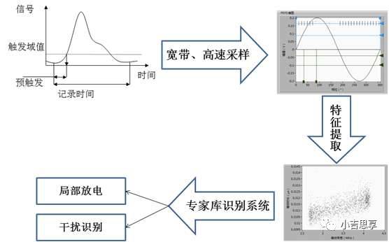 系统采用高频局放脉冲电流传感器和具备高速大容量数据采集的局放数据采集单元,在100KHz~30MHz宽频带范围内对终端接地线、中间接头交叉互联线或接地线上的混杂信号进行抗干扰处理和采集。从强电磁环境中提取局部放电信号,对电缆系统本体及每个附件绝缘状况进行在线监测,形成局部放电图谱,分析判断放电类型,通过在线持续监测形成放电趋势图,从而更直观更容易的掌握电缆系统本体及附件的运行状态。