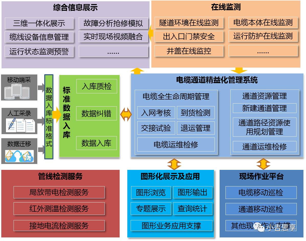 公司电缆通道资源综合管理解决方案提供涵盖电缆通道资源精益化管理系统软件、电缆通道在线监测硬件和系统集成、电缆通道资源数据采录服务和管线带电检测服务等几大方面,贯穿电缆通道从建设到运营的全过程,为电缆通道信息化管理各项工作开展奠定基础,实现电缆通道的自动化、科学化、精益化管理。