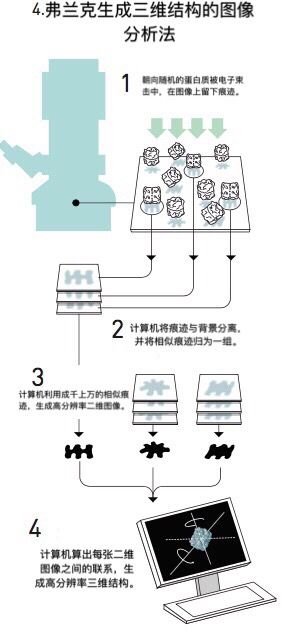 约阿希姆·弗兰克的方法(图四)基本原理是让计算机去自动分析电子显微镜获得的模糊二维图像,识别其中的蛋白质与周遭背景。他开发出一套数学方法,能够让计算机识别在图像中反复出现的模式。随后计算机将相类似的图像模式归类到一起并将这些图像中的信息进行合并叠加,从而生成更加清晰的图像。