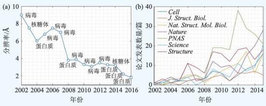 图1 冷冻电镜技术和单颗粒重构技术越来越备受关注(统计数据来源于EMDataBank )(a)不同年份中利用冷冻电镜单颗粒重构技术能够达到的最高分辨率;(b)通过冷冻电镜技术进行的研究成果在不同杂志上发表的论文数