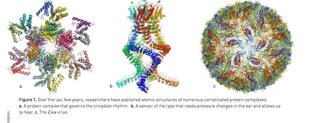 图一:过去几年间,科学家陆续发布了多种复杂蛋白质复合体的原子结构。a。 一种控制昼夜节律的蛋白质复合体。b。 一种可感知耳中压力变化、使我们听到声音的感应器。c。 寨卡病毒。