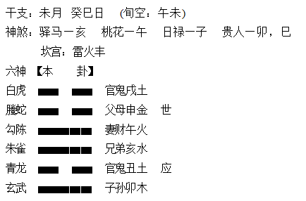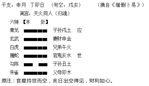 (2)爻与日令关系是爻克日、爻生日两种情况的,爻于日建是平相不显旺衰,这与月建出现此两种情况,按休囚衰相看有着根本区别。很多求学者不懂这个精细区别,把应用于月建的休囚论照搬硬套到日建中来用,造成了断事的不准确,这个应用于吉凶判断层面的基础知识点,是一定不能混淆。如申月丁卯日占出行见贵,摇得“天火同人”卦