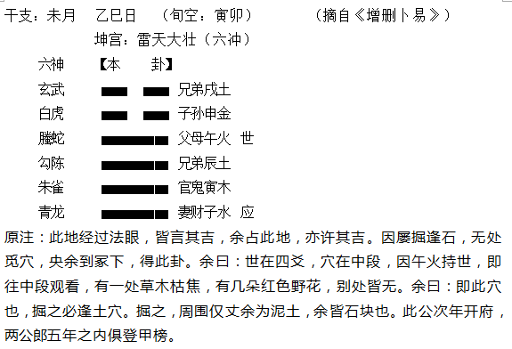 此卦问的是,这块地哪儿适宜作先辈墓穴之用。占墓穴如同占房占地,通取父母爻为用神,若将卦视为山势,一卦中可以对应地势之高低,初二爻为低端、三四爻为中段、五六爻为高端,卦中父母爻午火正处于四爻位置,所以适合的墓穴位置应在山地的中段。卦理上,用神须显旺相方为好穴,此卦用神父母午火,得月令未土之合旺,即凸显出用神的高层次旺相,而且火爻也寓意焦炭艳红之地,这山地中段的草木枯焦以及红花展现,其现状与父母临午火的信息是高度对应,故此段即为上佳宜葬之穴。果然先人墓葬于此穴后好事连连,五年之内众家人升官的升官、中榜的中榜。