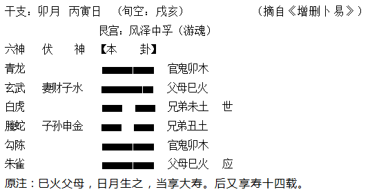 (1)假设申金为用神,在卯月午日占卜,则申金在卯月论休囚显衰,同时申金被午日克也论衰,申金于日月组合皆属于衰败,所以申金在日月总体为衰相。又例,卯月丙寅日占祖母寿,得卦“风泽中孚”