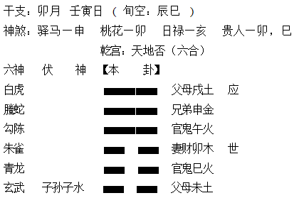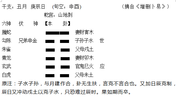 (14)假设子水为用神,丑月亥日占卜,丑月对子水,两者既相合同时又相克,可论月合显旺也可论月克显衰。若子水论月合,爻得月合显旺,同时爻得日扶也旺,子水于日月同旺总体为旺相;若子水论月克,则爻被月克显衰,同时爻得日扶显旺,两者都属一般层次的作用力,两股性质相反的力量同时落在子水身上,爻于日月组合一旺一衰彼此抵消,则子水总体为平相。那子水于丑月该论合或是论克?正确方法一如上例:对照事情客观现状为依据作判断。事实上若存有受克伤之实情,则按克论,若存有得趋合合作的事实,则按合论即可。类似情况还有戌土遇卯月、申金遇巳月等等,彼此也是既相合又相克。《增》书中野鹤对戌土遇卯月,该论合或论克也有专门论述,但可惜他提出的“爻旺论合爻衰论克”分辨论点,却有点不切实际的嫌疑,不可取之为常用法则。如之上所举《增》书丑月庚辰日占子病,得“山地剥”之例,野鹤原想举此例,说明因用神子孙子水受动克、日克衰败,所以虽月建作合仍言克不言合,以证其论。但此卦致凶的关键并非日月组合该怎样论,而是动变组合的原因,卦中的忌神戌土,在月扶旺的状态下受日令冲成暗动,动而克伤用神子水,这才是事凶的核心信息,月令对用神该论相合或论相克,根本无法左右大局,无法证明论据。再看一例十几年前的旧卦,卯月壬寅日占父急症吉凶,摇得“天地否”
