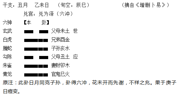 (15)假设未土为用神,于寅月卯日占卜。寅月与卯日一起对用神未土构成同步克伤,用神于日月整体定为衰败。这类日月组合对用神的综合定性不难,之所以特意挖出来讲,是因为日月齐齐克伤世用的显示模式,它是反映事情的目前现实状况或环境,处于非常不利或陷入绝境的一种信息。经验丰富的易者往往能通过这类特殊显像,迅速了解到事件当事人当前处在格外困难的处境。例如丑月乙未日,占子发热,问是不是患了痘症?得卦“兑为泽”