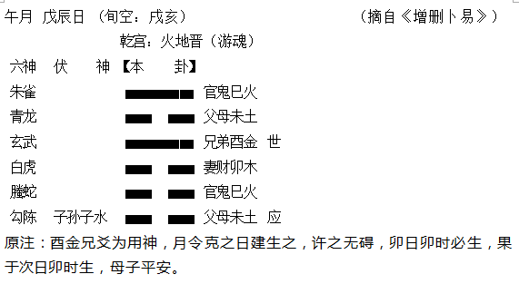 (3)静爻得日令合则显旺相,在吉凶判断层面,这是日令使爻旺相的其中一种模式。但爻若是动爻,则不能这样看,爻动被日合,叫日绊,意味爻被绊住不能动弹,为“三绊”理论中的一种模式,以后有专门章节论述。古论有“静而逢日合,谓之合起;动而逢日合,谓之合绊”,说的就是这层意思。这必须区分清晰。如午月戊辰日占妹临产吉凶,得“火地晋”