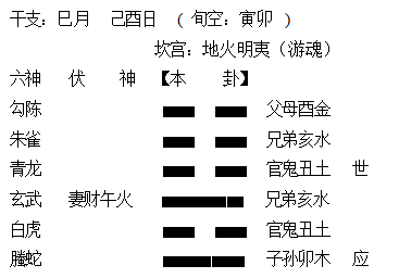 (4)假设卯木为用神,在酉月亥日占卜,则卯木被酉月破显衰,同时卯木得亥日生显旺,但月破属于高层次的衰败力量,日生仅是一般层次的旺相力量,月破对卯木的作用力大于日生对卯木的反作用力,所以爻总体仍为衰相。又例如兄占妹此段姻缘能挽回否,摇得“地火明夷”卦