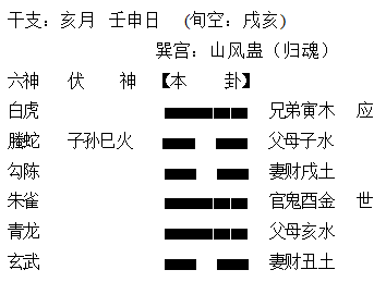 我答:“卦辞中,蛊乃“有所用事”之意,自然是主动地去蓄意谋求的寓意。虽然形成财爻生世的吉利格局,可惜的是成事在‘天’,卦中用神妻财戌土,在日月总体衰弱又逢空,此属真空,用神衰败事难成,这财到底难求。”