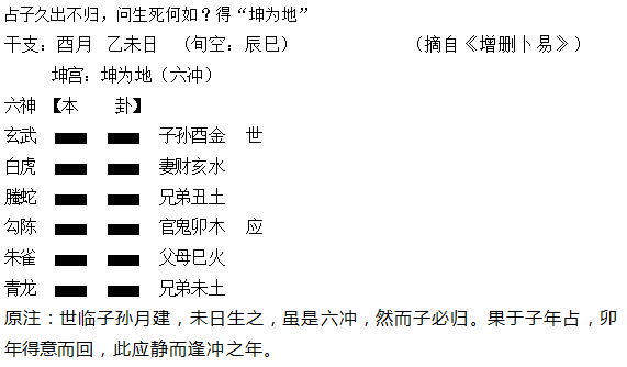 问儿子之事,子孙酉金为用神,卦无动爻当看日月组合,子孙酉金临月建的同时,又得日生而大旺,其子必吉利。应期上用神静旺逢冲应事,因此应在冲用神的卯年荣归。此卦即使用神子孙酉金于日令显出衰败,只要不是高层次的衰败力量,酉金总体仍偏旺,因爻临月建亦属高层次的旺相力量,并不是一般层次的反作用力所能抵御的。