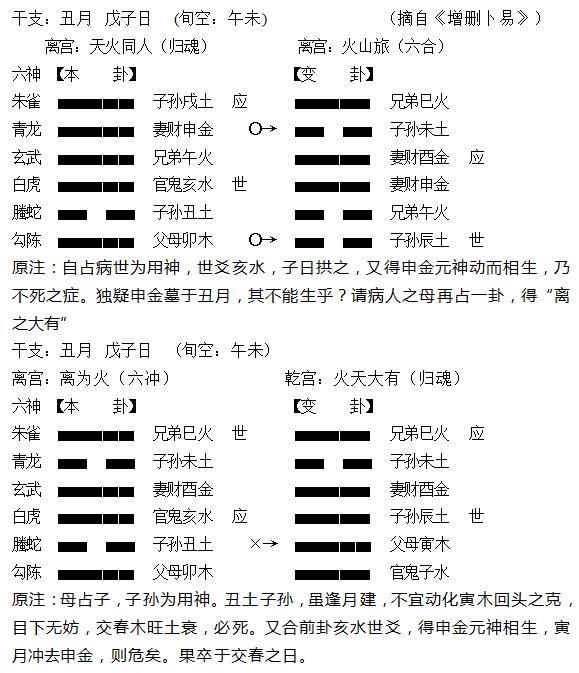 此占的最后结果是病人死于交春之日。吉凶判断上,第一卦野鹤老人怀疑元神申金入丑土月墓,不能生世而需要再占。可以说他在此卦吉凶判断上出现了偏颇,牵强地认为,可能是申金被丑月所墓不能生世而致凶,其实他也不敢肯定自己的判断,所以要再占。很明显,这说法站不住脚,在吉凶判断层面,并不存在月墓,此丑月对申金,作用力只能是生旺而非墓困,其卦凶的真正原因,依然在于动变组合。卦中卯木明动,同时午火在空亡的状态下受日令冲动,午火冲空即实成为暗动之爻,明暗两动爻构成木火连动,能量聚集到午火身上,进而克制生世的动爻元神申金,使之不能生旺世爻,养命的元神申金受到阻隔,不能将生旺动能传导给世爻,命源不继预兆了病人命将不久,凶局即成。因此其母再占得出的“离之大有”卦,充分体现出疑惑条件下再占的威力,既答复又答疑。卦象通过用神子孙丑土遭遇变爻寅木回头克,再次明确病人将于寅月危殆的同时,还突出了伤用神之关键信息是“寅木”这个元素,而野鹤于首卦怀疑不利的对象,是“申金”这个信息点,寅木的特性天然与申金相冲背向,野鹤因怀疑申金问题而再占,再占之卦,却点明“寅木”才是不利的罪魁祸首,暗中寓意了卦凶的真正问题所在,并非在于申金遭遇月墓,而是因为其他缘故(午火暗动)。