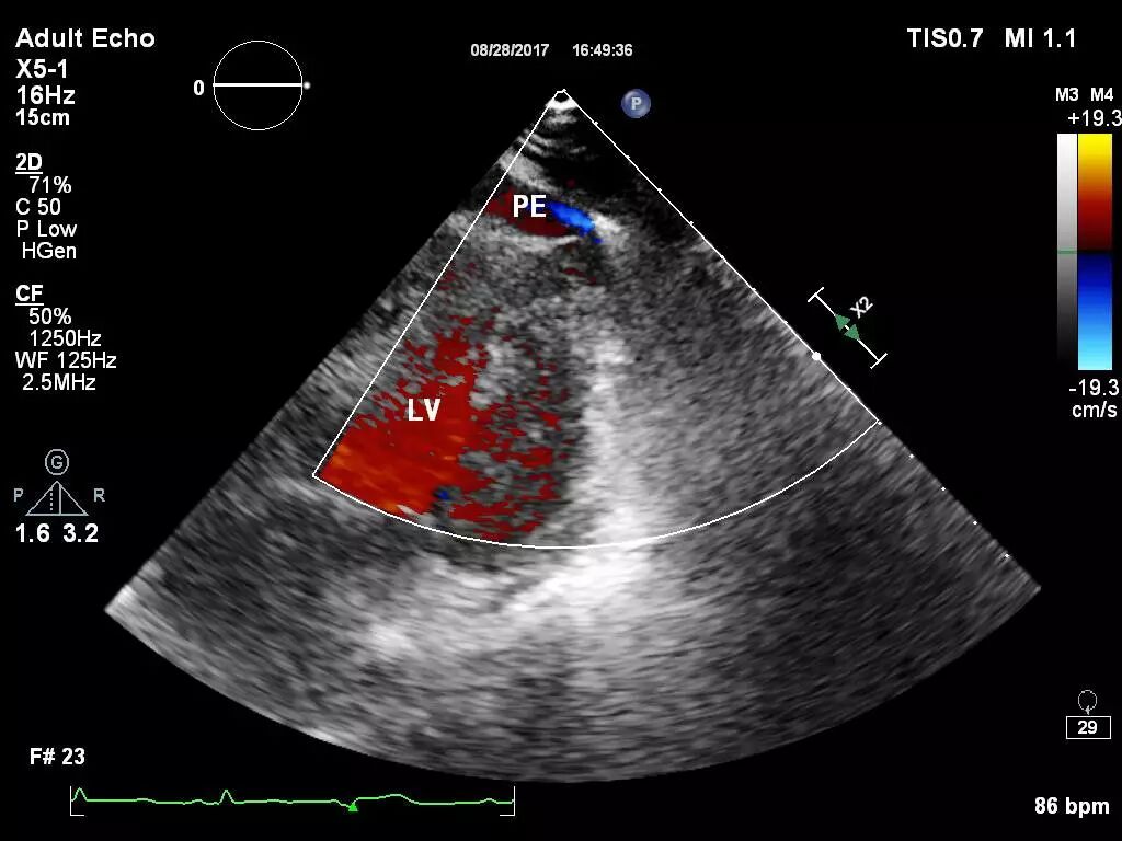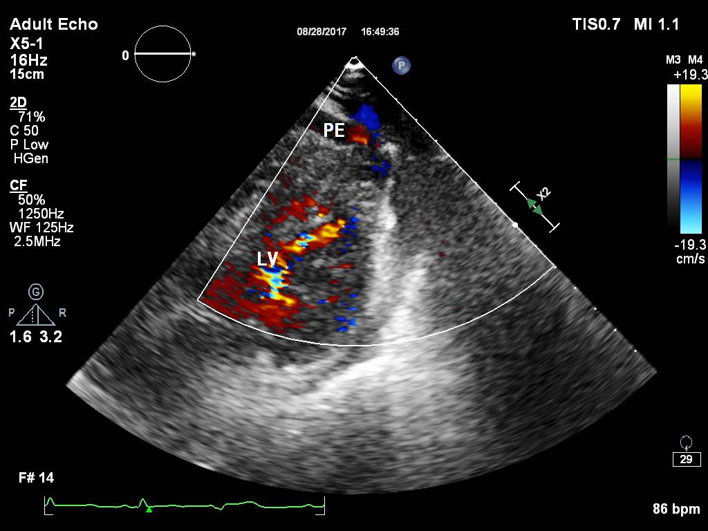 图3和图4: 彩色多普勒:心包腔可见可疑的较明亮彩色信号。