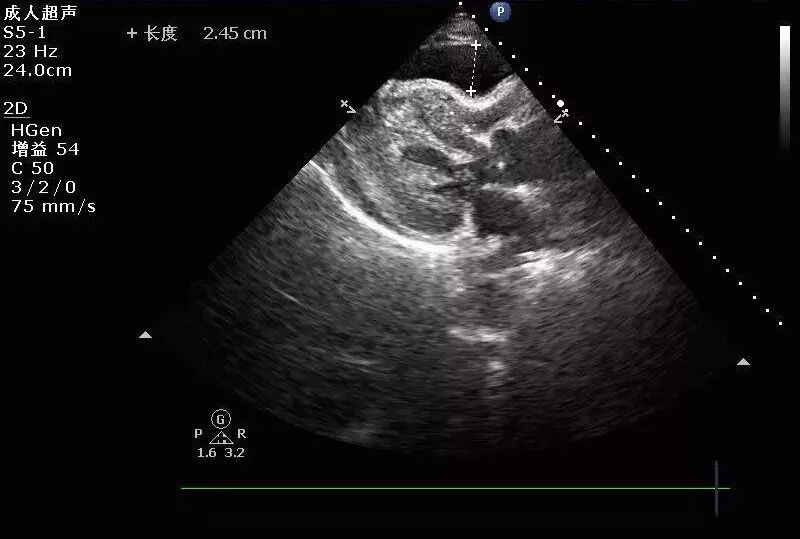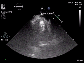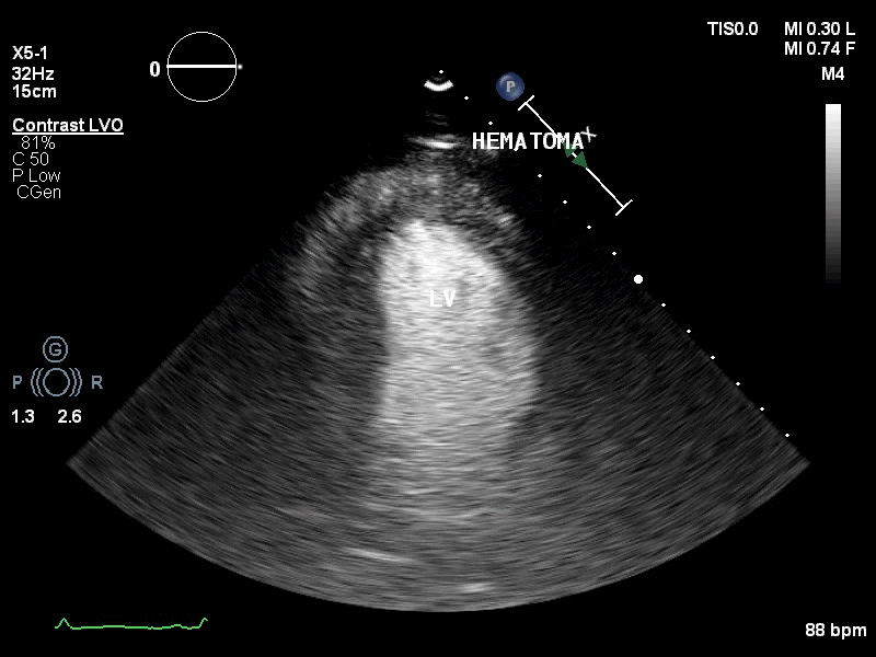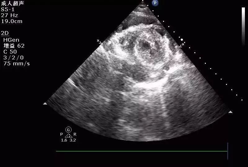 视频1:左室心尖可见团块状低回声,疑似血肿。