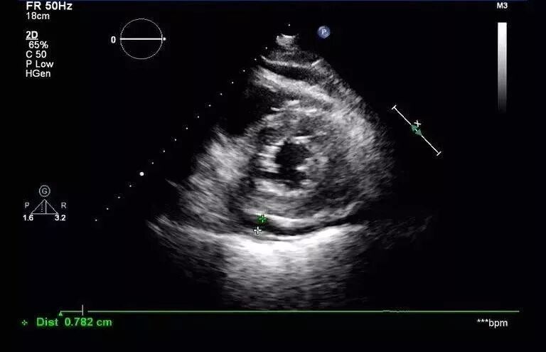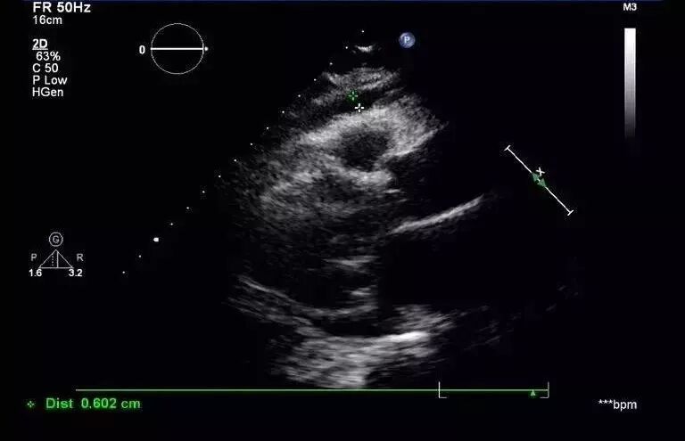 图6 :心包腔见液性暗区,右室前壁4mm,左室后壁5mm。