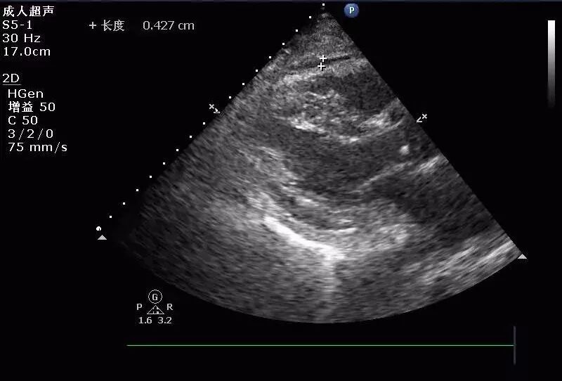 图5: 2017年8月30日复查经胸超声心动图提示:左室靠近心尖处血肿形成。少量心包积液。左室靠近心尖处外壁可见一低回声包块,大小约40mmx21mm,边界尚清。